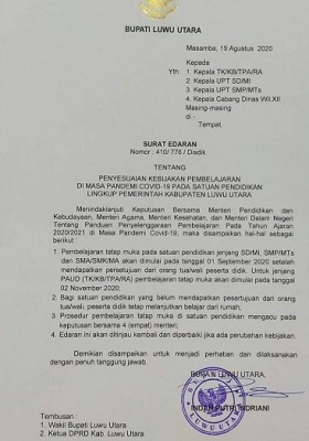 Pembukaan sekolah tatap muka di Lutra ini sudah lebih dulu disampaikan Bupati Luwu Utara, Indah Putri Indriani melalui surat edaran yang diterbitkan pada 19 Agustus lalu.