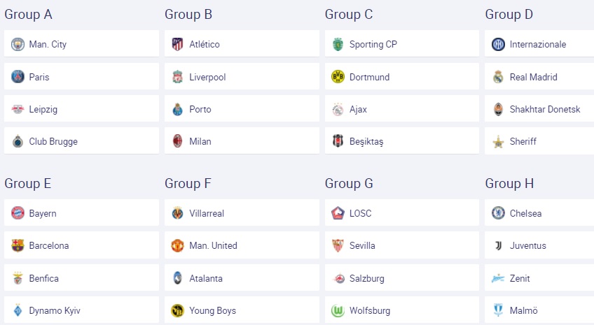 Adapun Grup C dihuni Sporting CP, Borussia Dortmund, Ajax dan Besiktas (Turki).