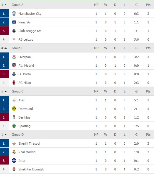 Di Grup A, Manchester City yang menang 6-3 atas RB Leipzig memuncaki klasemen sementara.