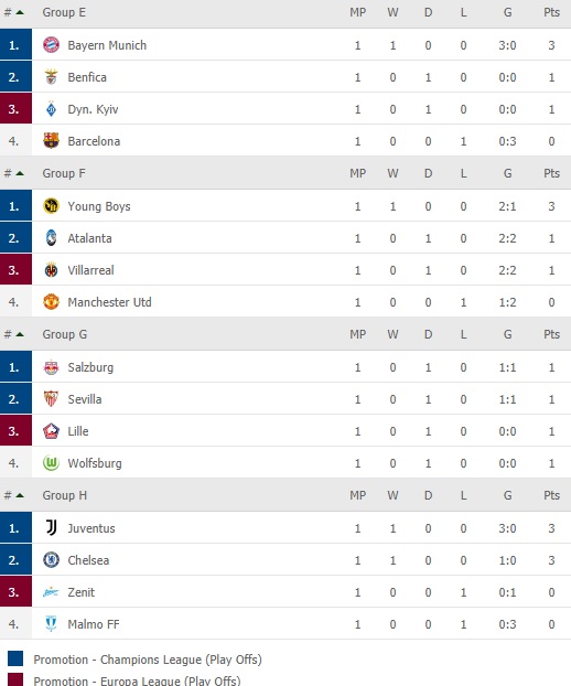 Dari Grup E, Bayern Munich untuk sementara duduk di puncak klasemen berkat kemenangan 3-0 atas Barcelona di Camp Nou. Benfica dan Dynamo Kiev di urutan kedua dan ketiga, dengan 1 poin.