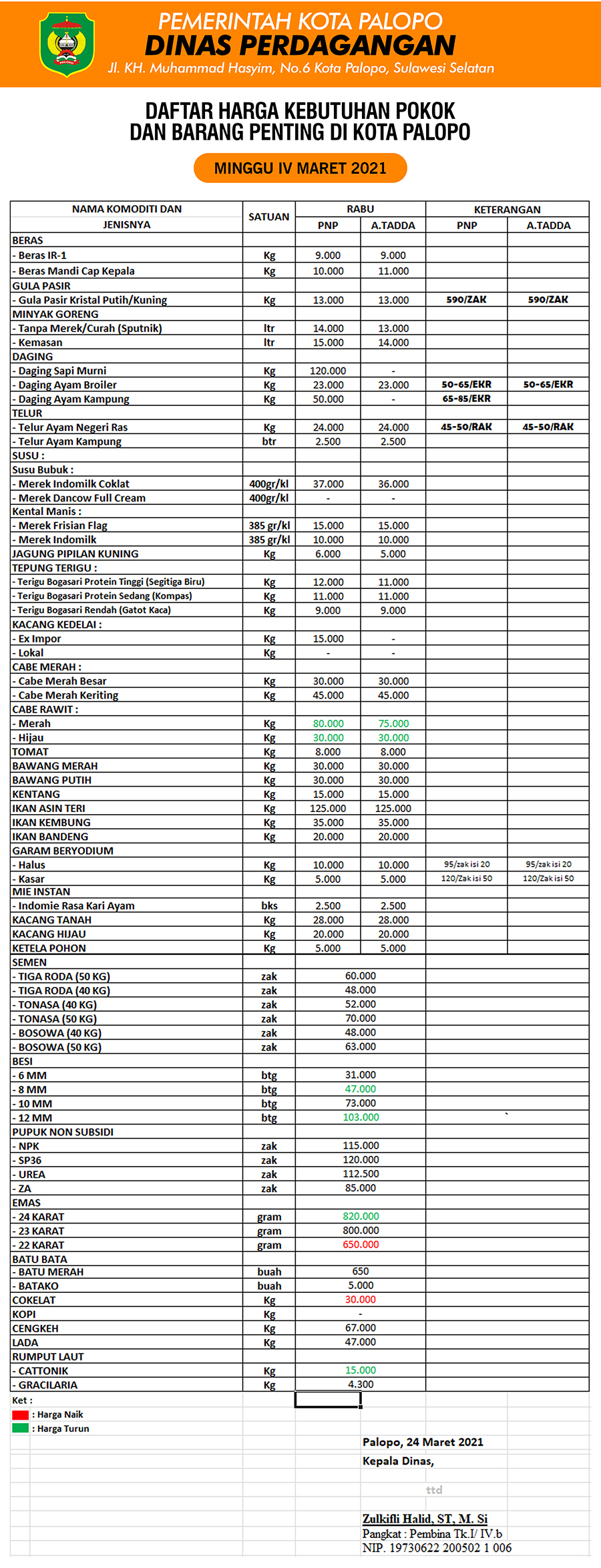 Daftar Harga Kebutuhan Pokok dan Barang Penting Kota Palopo