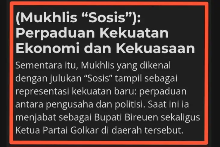 “Mukhlis yang dikenal dengan julukan “Sosis” tampil sebagai representasi kekuatan baru: perpaduan antara pengusaha dan politisi,” Tulis rakyatmardeka.com.