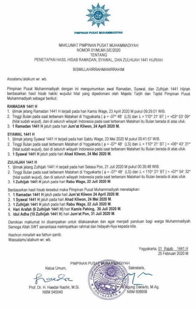 Kemudian Idul Adha 10 Zulhijah 1441 H jatuh pada Jumat Pon, 31 Juli 2020 M. Maklumat awal puasa itu ditandatangani Ketua Umum PP Muhammadiyah Haedar Nashir dan Sekretaris Agung Danarto.