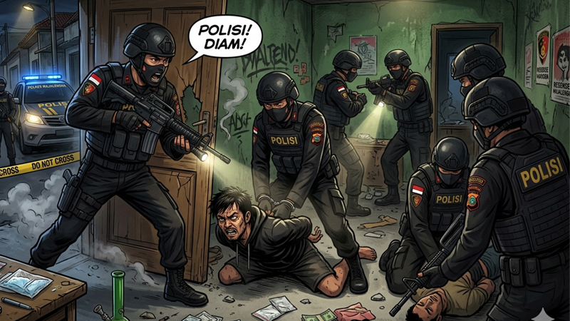 Atas perbuatannya, OP terancam hukuman berat. Ia dijerat dengan Pasal 114 ayat (1) UU RI No. 35 Tahun 2009 tentang Narkotika, dan/atau Pasal 609 ayat (1) huruf a UU No. 1 Tahun 2023 tentang KUHP, sebagaimana telah diubah dalam UU RI No. 1 Tahun 2026 tentang Penyesuaian Pidana.