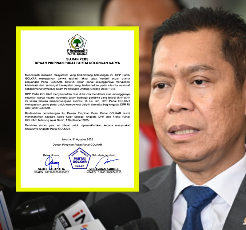 TERASKATA.Com, Jakarta – Partai Golkar menonaktifkan Adies Kadir sebagai anggota DPR RI Fraksi Partai Golokang Karya. Penonaktifan itu dilakukan DPP Golkar menyusu pernyataan Adies Kadir yang memicu kemarahan masyarakat.